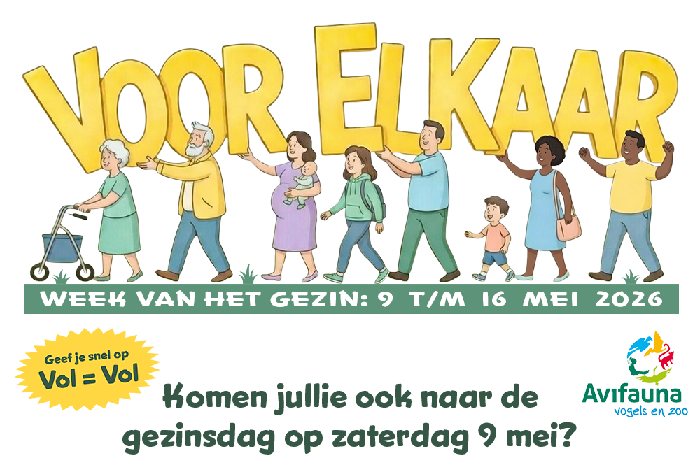 Komen jullie ook naar de Gezinsdag op zaterdag 9 mei. We komen dit jaar samen in vogelpark Avifauna in Alphen aan den Rijn. Klik hier voor meer informatie.