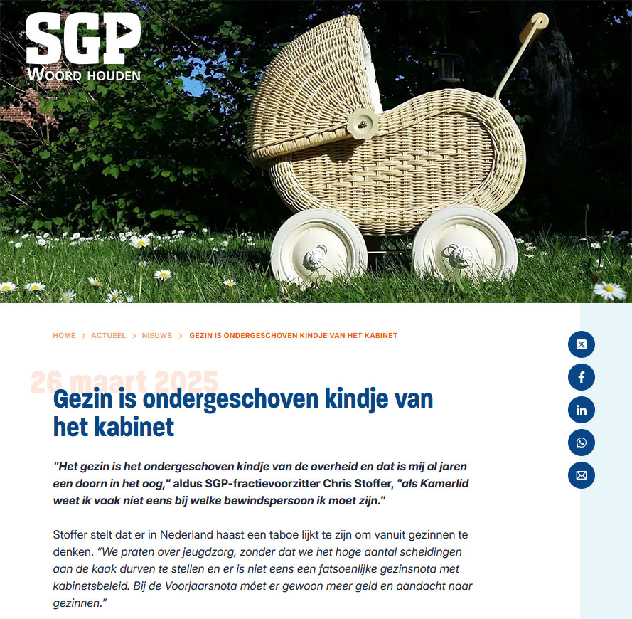 "Het gezin is het ondergeschoven kindje van de overheid en dat is mij al jaren een doorn in het oog," aldus SGP-fractievoorzitter Chris Stoffer, "als Kamerlid weet ik vaak niet eens bij welke bewindspersoon ik moet zijn."